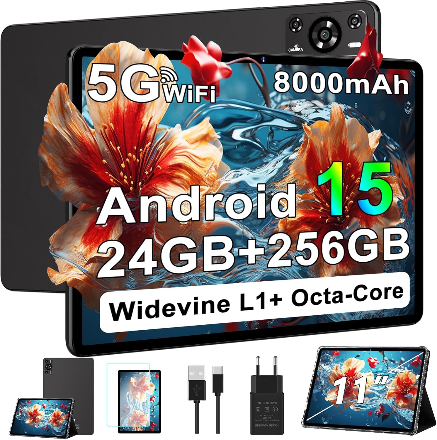 • 11 Inch Tablet, 2025 Android 15 Tablets with Octa Core, 24GB+256GB, 13+5MP Camera, Electronics Tablets with Widevine L1, 8000mAh Battery, 5G WiFi, GPS, HD IPS Display, 1TB Expand, BT 5.0 -Metal Black